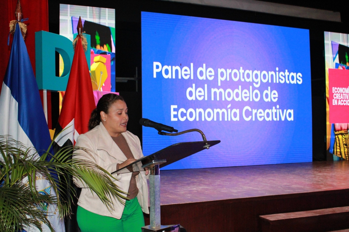 De igual manera, la Compañera Sonia Porras, Secretaria Adjunta de Economía Creativa y Naranja, presentó los alcances de los concursos de Economía Creativa desarrollados en 2025, impulsados gracias a la cooperación de la Embajada de la República Popular China en Nicaragua; y presentó el Panel: “Protagonistas del modelo de Economía Creativa”.